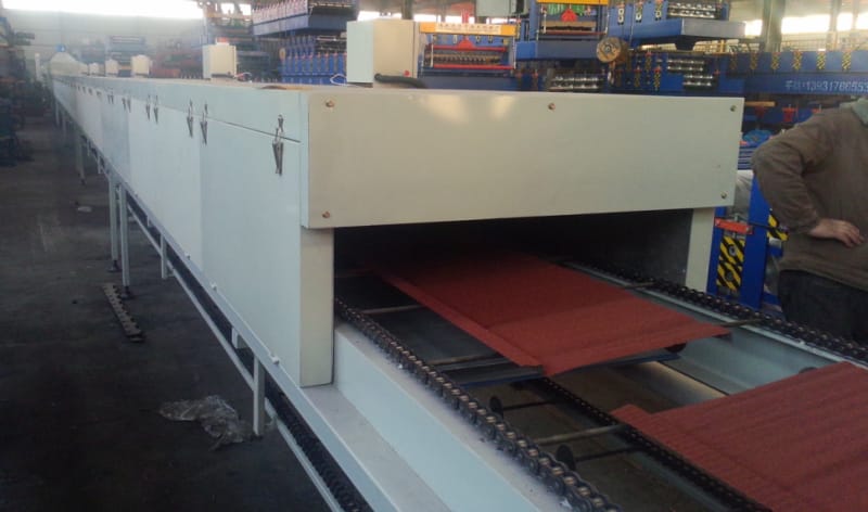 彩石瓦設(shè)備是以氣、電、機(jī)械為一體的,集噴膠、布沙、烘干等功能為一體的全自動(dòng)生產(chǎn)線。